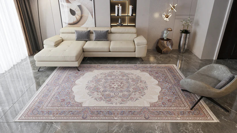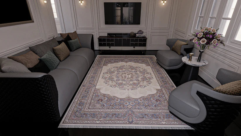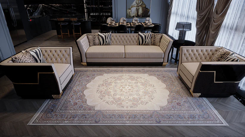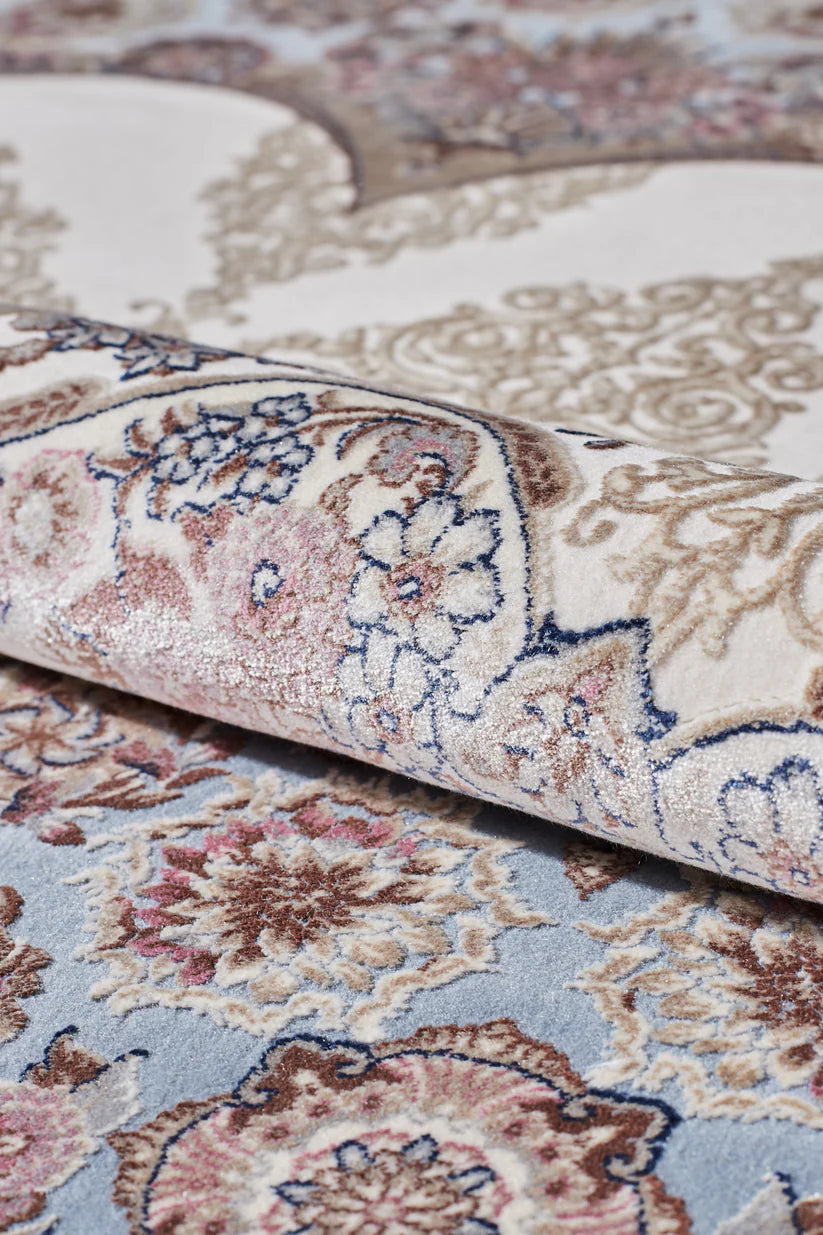 Bu halı, krem bej rengi bir fon ve yumuşak mavi ve gül tonlarıyla vurgulanan süslü bordürlerle çevrelenmiş karmaşık çiçek madalyonuyla zamansız bir zarafet havası yayıyor . Özenle işlenen yüksek yoğunluklu dokuma, göz alıcı olduğu kadar dokunuşa da lüks bir hava katarak ihtişamlı bir his yaratıyor . Sofistike renk paleti ve detaylı desenleri, her odanın ambiyansını zarafet ve şıklıkla zenginleştirecek bir parça.